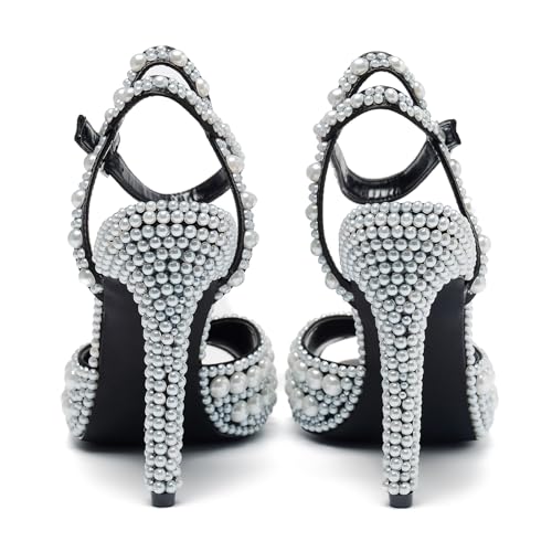 Women's Sparkly Pearl Open Toe Ankle Strap Stiletto 4.3IN Heel Sandals Nightclub Party Wedding Shoes 4