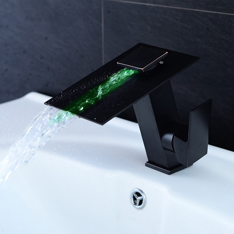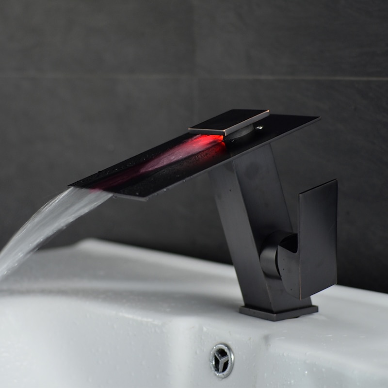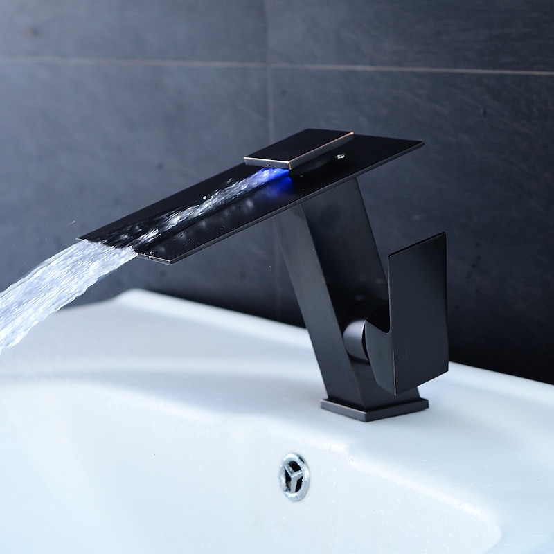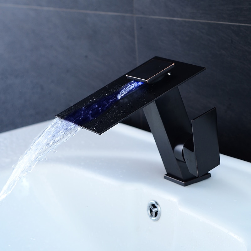 Bathroom Faucet LED Waterfall Spout 3 Color Changes with Temperature, Sink Mixer Mono Basin Taps, Single Handle One Hole Brass Washroom Vessel Tap Deck Mounted