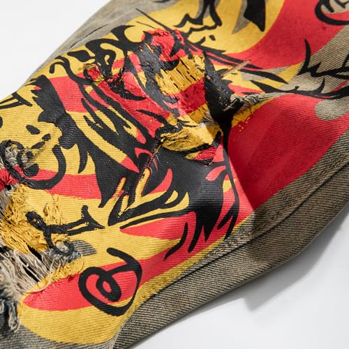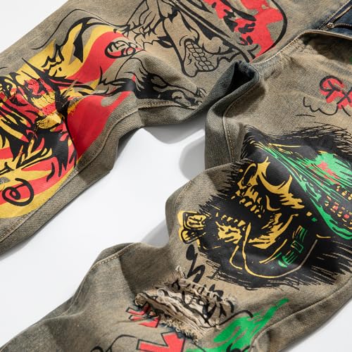 More information about Men's Designer Skull Print Denim Jeans, Straight Leg, Distressed Ripped Style, Artistic Graffiti Pattern