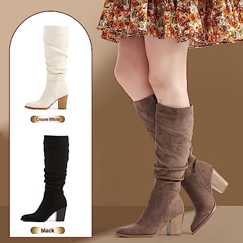Putu Women's Pointed Toe Knee High Boots Faux Suede Slouch Boots with Chunky Heel 6
