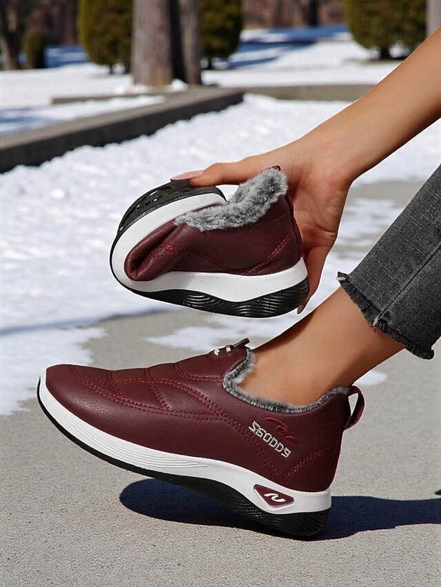 Women's Burgundy Winter Slip-On Sneakers – Faux Leather Warm Lined Shoes with Non-Slip Sole for Outdoor Casual Wear 12