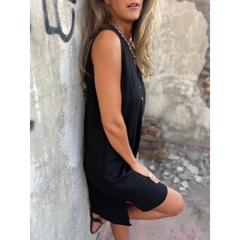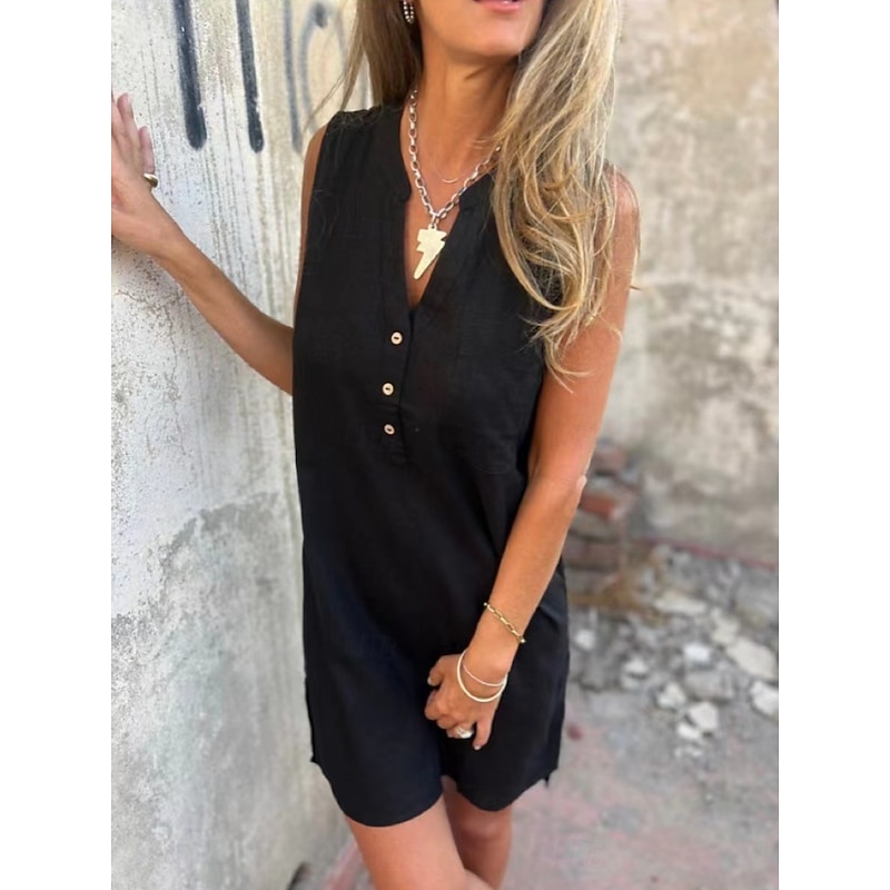 Highlights - Stay cool and stylish this summer with this women's sleeveless tank dress - Made from high-quality polyester fabric, perfect for daily wear - Features a flattering V-neckline and button design for a trendy touch - Versatile and basic style can be dressed up or down for any occasion - Mini length makes this casual dress perfect for any summer outing