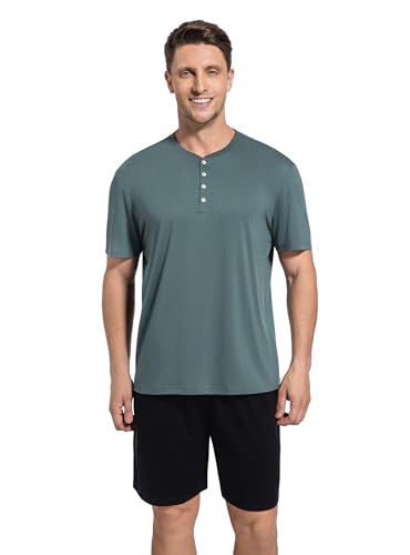 HOT ! SlumberMee Mens Pajama Set Soft Cooling Viscose Summer Pjs Short Sleeve Sleepwear 2 Piece Set Henley Loungewear with Pockets