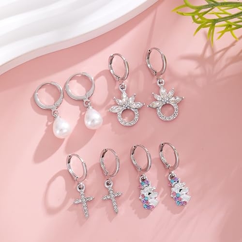 16 Pairs Hypoallergenic Silver Small Hoop Dangle Earrings Set for Girls Women Cute Heart Cat Butterfly Pearl Bow Huggie Hoop Dangle Earrings for Little Girls Kids Jewelry Gift 4