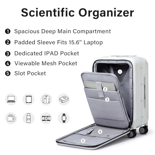 MILADA Wide Handle Carry On Luggage with Front Pocket Hardshell 20 Inch Front Opening Luggage with Spinner Wheels TSA Lock Aluminium Suitcase Airline Approved Carry-On Travel Luggage, White