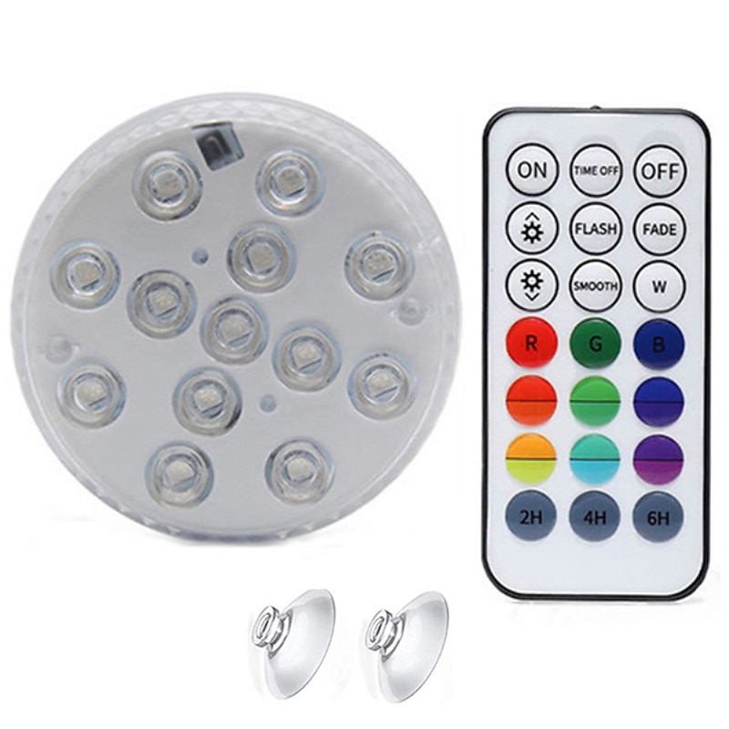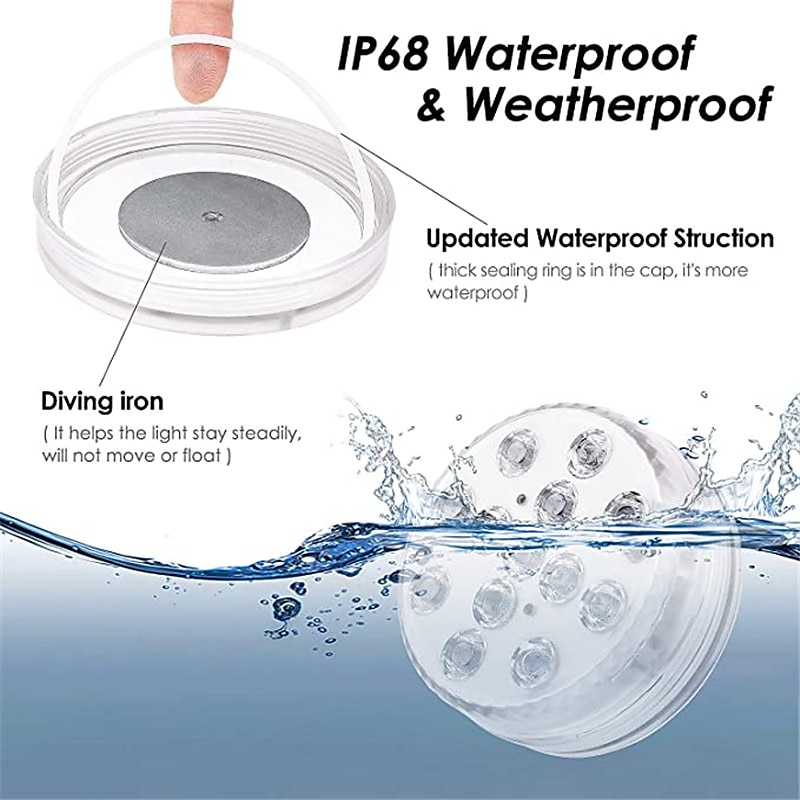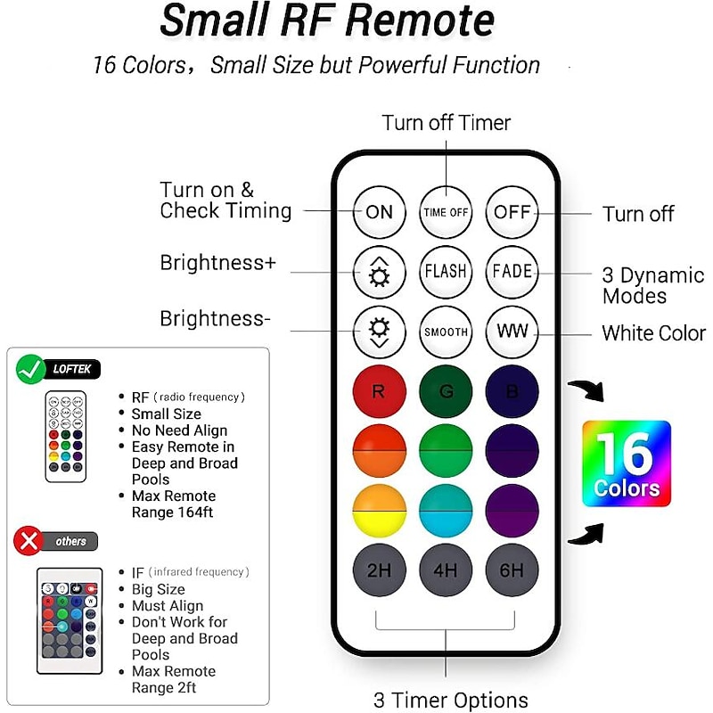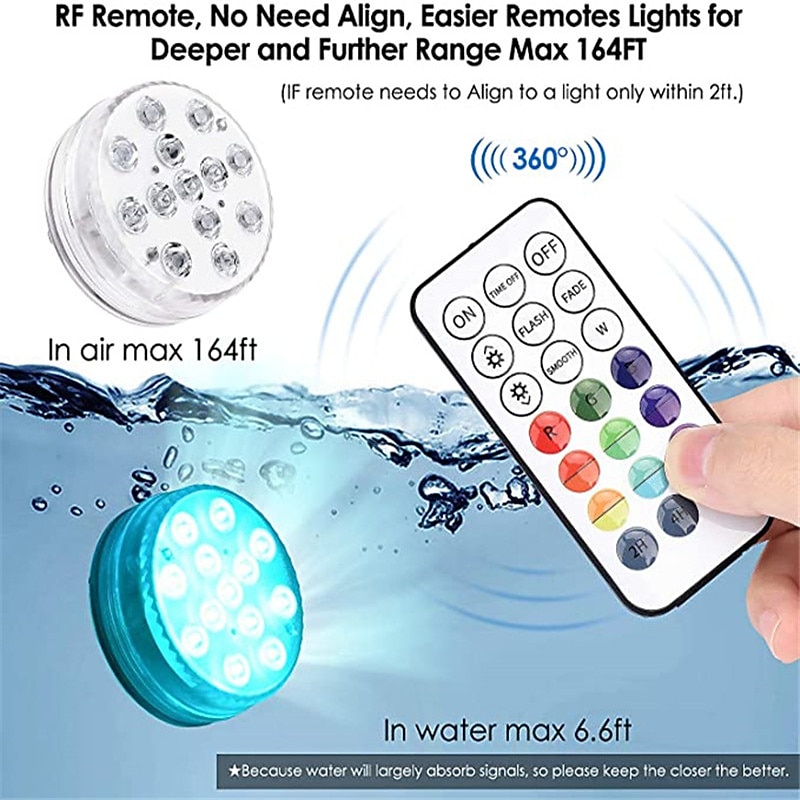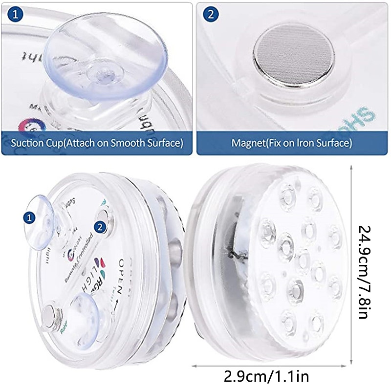 Highlights 1. Dimmable Pool Light: - Optimized with 16 dynamic colors and multiple modes (flash, fade, smooth) - Increased 4 timer buttons (2h, 4h, 6h, 24h) for convenience - Dimmable function for creating a beautiful atmosphere 2. Magnets and Suction Cups: - IP68 waterproof submersible lights with strong magnets and suction cups - Upgraded full waterproof weatherproof structure - Suitable for use as decor light, ambience light, or night light both indoors and outdoors 3. Upgraded RF Remote Control: - Works with RF remote control, allowing easy operation within a range of 164ft/50m in air and 16.4ft/5m underwater - Change colors or adjust brightness from a distance with ease 4. Variety of Usage: - Simple installation with strong magnets and large suction cups - Works well in both wet and dry places - Can be used for decoration in various locations with its multi-color LED lights.