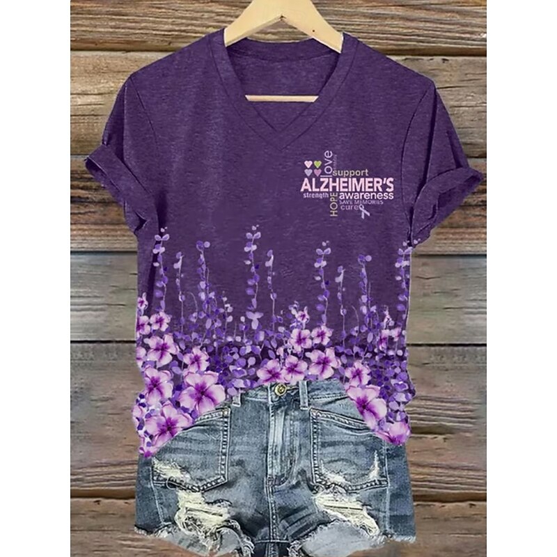 Women's Alzheimer's Disease Awareness T Shirt Floral Graphic Plants Bohemia Vintage Stylish Short Sleeve V Neck Regular Tops Daily Going out Weekend Print Black White Blue Purple Violet Summer 2