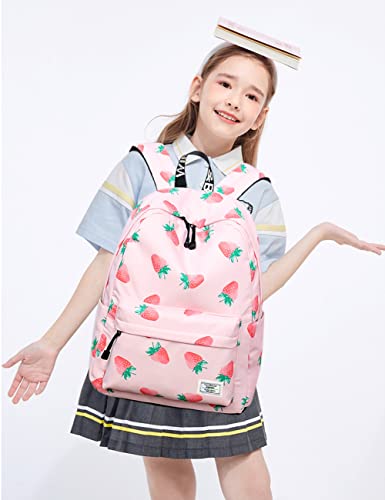 MIRLEWAIY Pink Strawberry Backpack for School Girls Lightweight Teen Primary Bookbag, Pink Strawberry 6