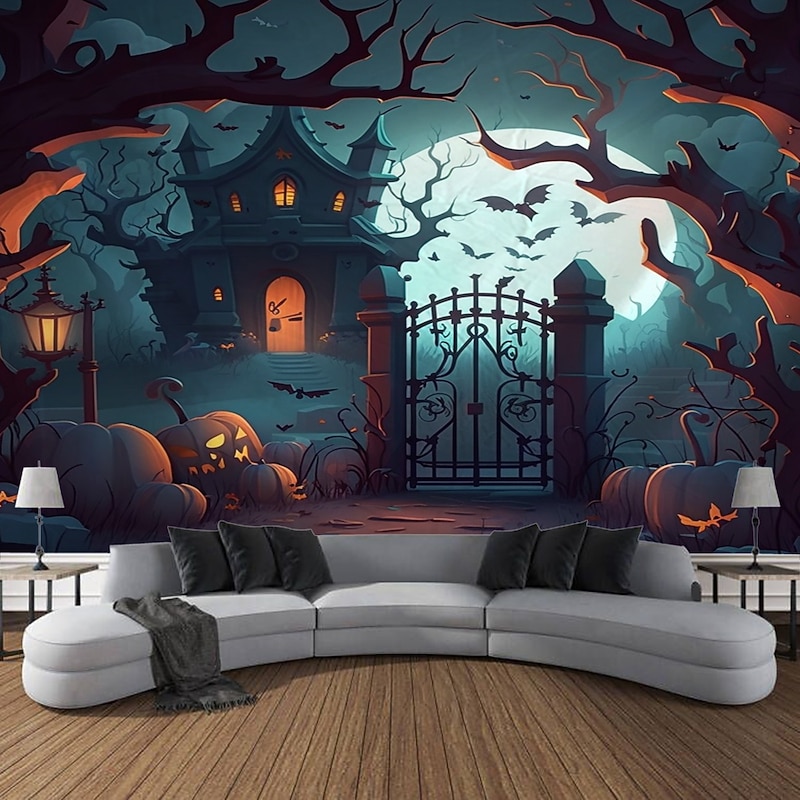 Halloween Decorations Wall Art Large Tapestry Mural Photo Background Blanket Curtains Bedroom Living Room Decoration Horror Pumpkin Monster Graveyard Haunted House 5