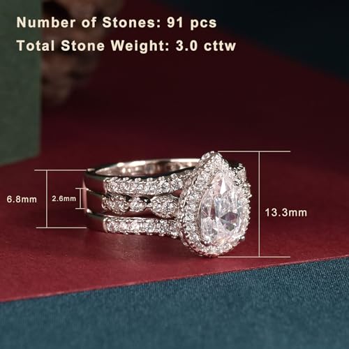 • Specification: Main Stone Size:6.0*9.0mm, 1.5ct. Total weight: 3.0CTTW. 18K White Gold plated. Pear brilliant shape. Minimal wedding ring set and made for everyday wear.