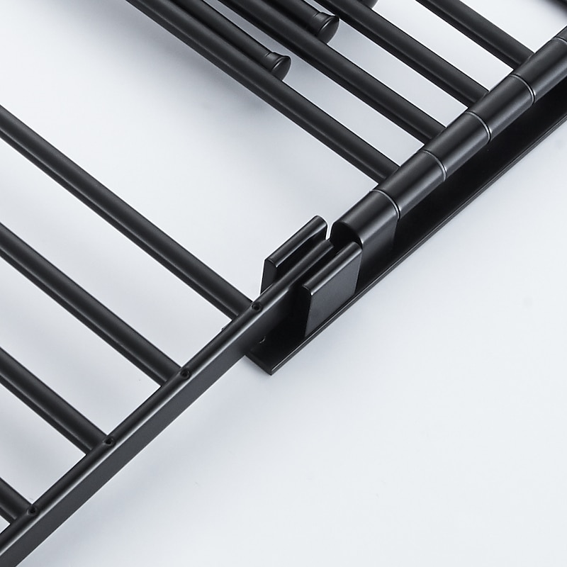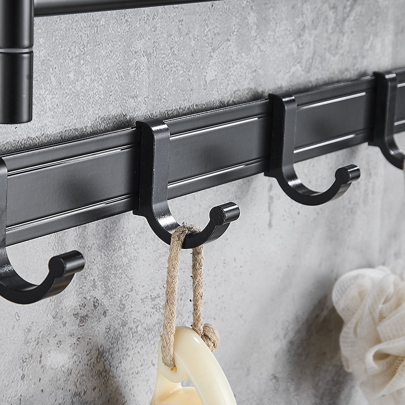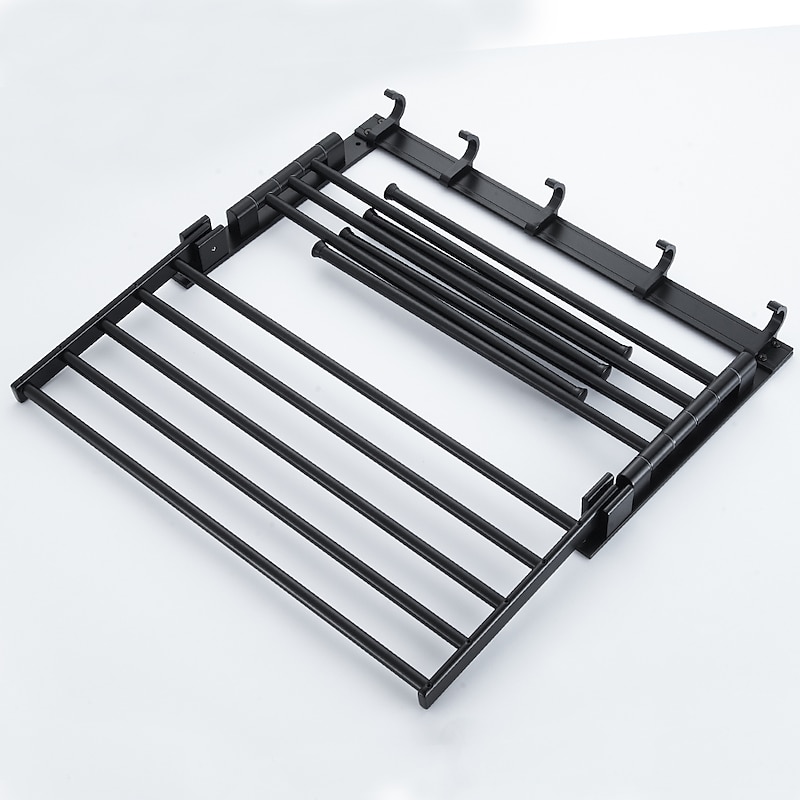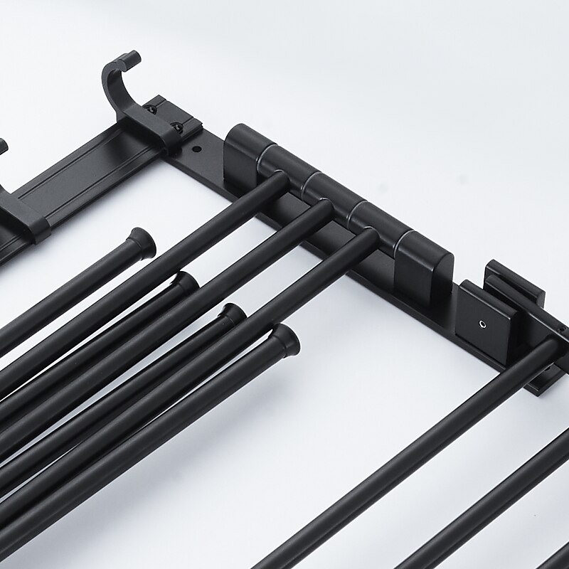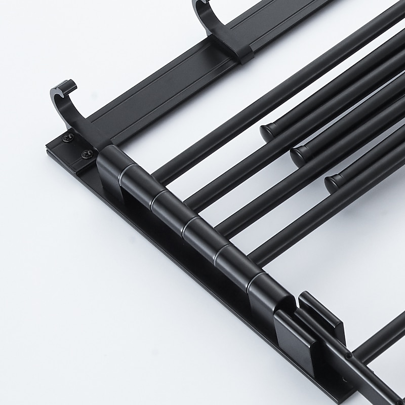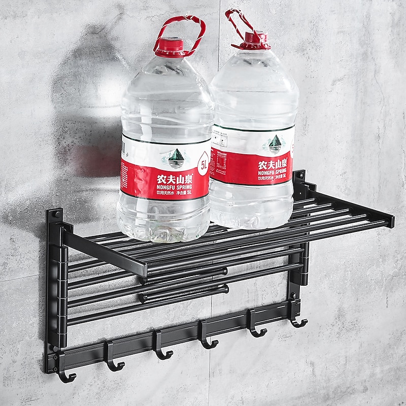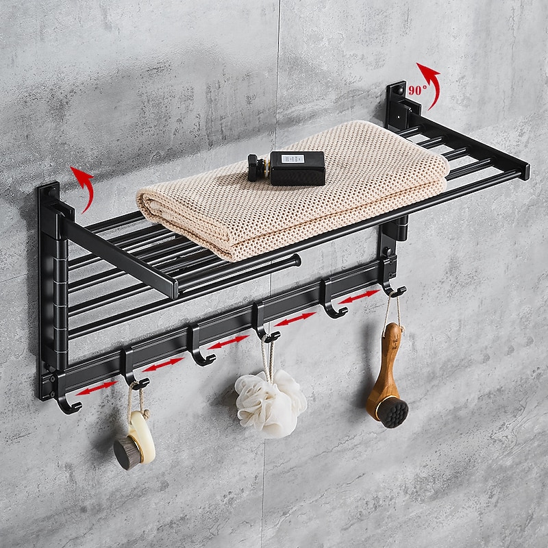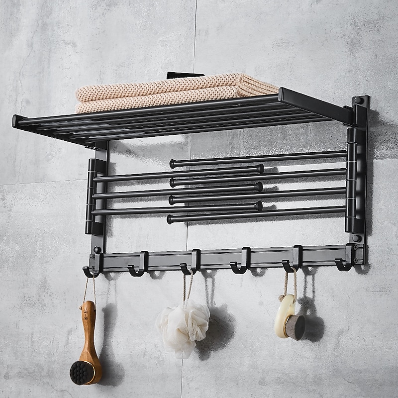 Highlights - Features foldable design to save space; ideal for smaller apartments, bathrooms, and pantry rooms - Comes with all installation accessories and instructions for easy installation without welding - Made of high-quality space aluminum for no rust/corrosion, no fading, high durability, and eco-friendliness - Equipped with 5 hooks to hang clothes, towels, bath sponges, shower caps, etc. - Multifunctional design to meet different daily needs; perfect for humid environments like the bathroom and kitchen.