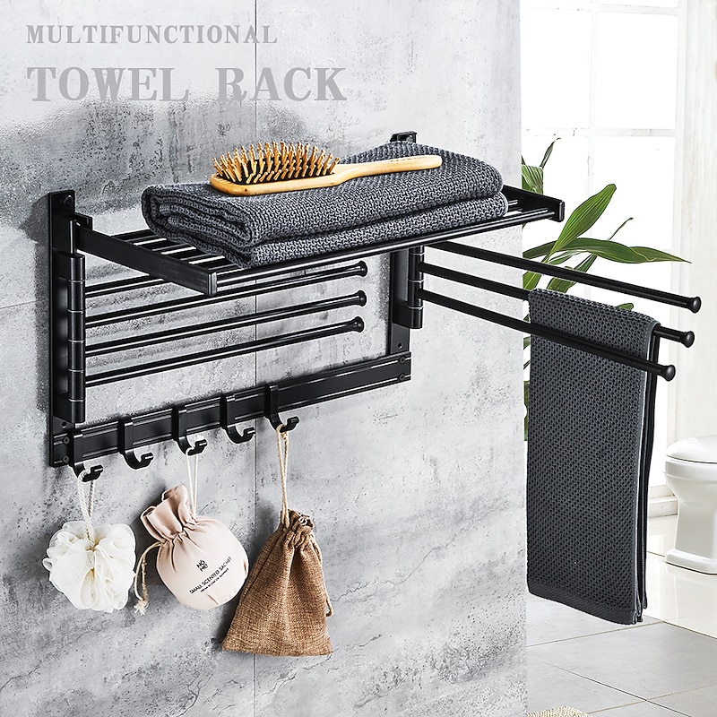 HOT ! Stainless Steel Towel Rack,Bathroom Towel Rack with Shelf,Foldable Towel Shelf with Movable Hooks Rustproof Towel Storage Wall Mount for Bathroom Lavatory Matte Black
