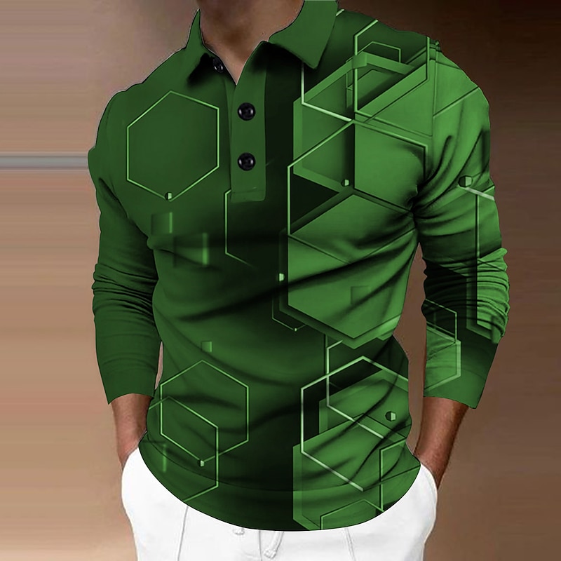 Men's Geometric Polo Shirts Golf Shirt Long Sleeve Polo Shirts Collared Shirts Casual Vacation Wear Formal Wear Festival Wear 3D Print Buttons Yellow Army Green Red 17