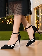 More information about Women's Black Satin Pointed Toe Stiletto Heels with Crystal Embellishments and Ankle Strap - Elegant Party Shoes for Cocktail and Evening Events