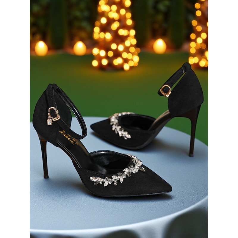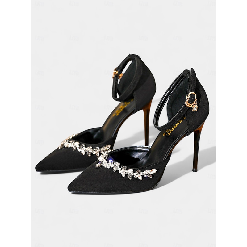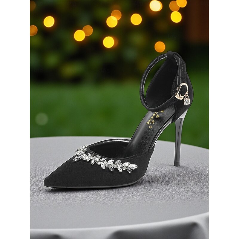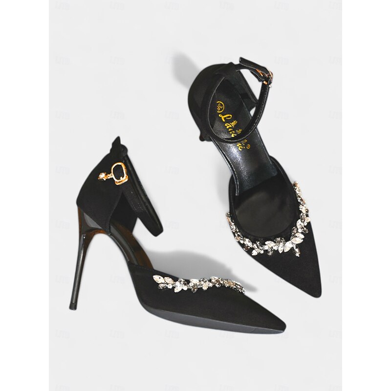 HOT ! Women's Black Satin Pointed Toe Stiletto Heels with Crystal Embellishments and Ankle Strap - Elegant Party Shoes for Cocktail and Evening Events