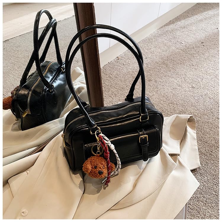 HOT ! Vintage Shoulder Bags for Women Brown Purse Bowler Bag Faux Leather Shoulder Purse Y2k Hobo Tote Handbag with Pendant
