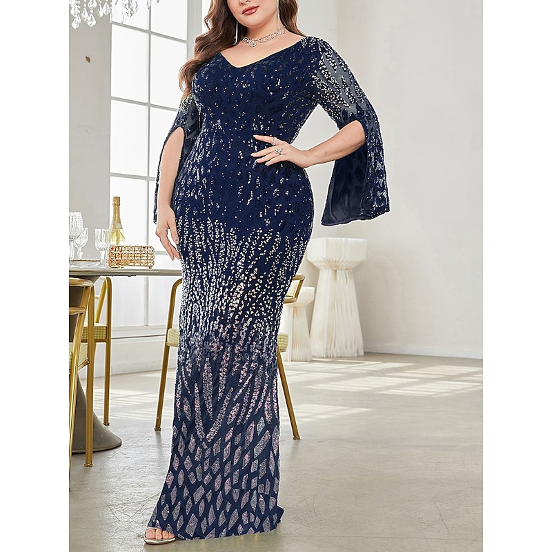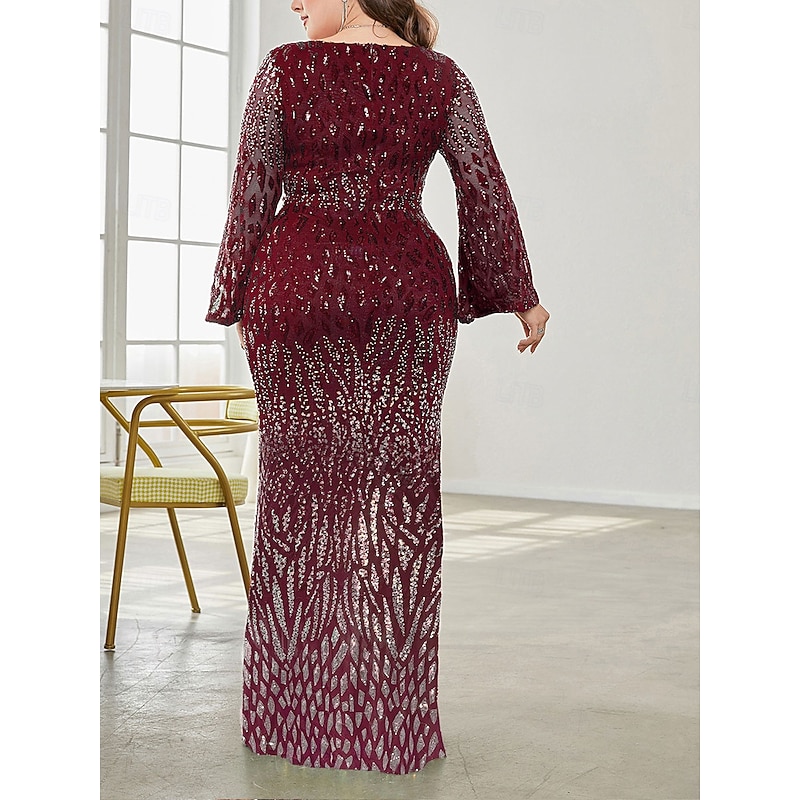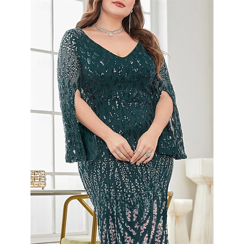 More information about Plus Size Dress Mother of the Bride Curve Dress Elegant Party V Neck Floor Length Spandex Long Sleeve with Sequin