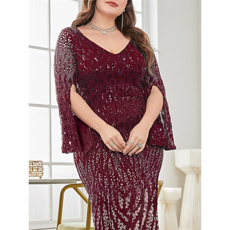 Plus Size Dress Mother of the Bride Curve Dress Elegant Party V Neck Floor Length Spandex Long Sleeve with Sequin 30
