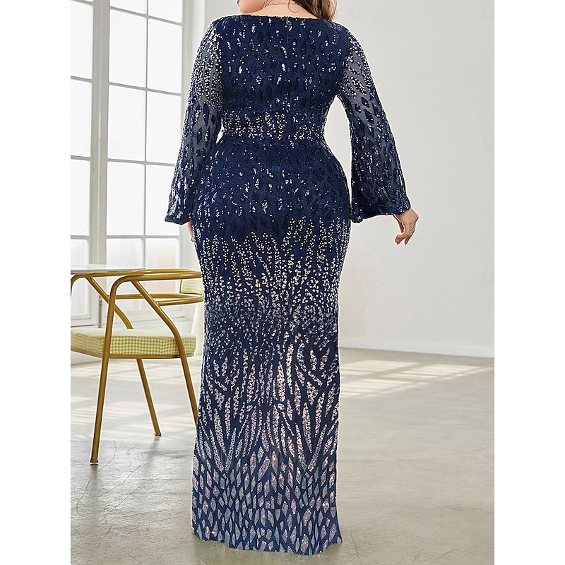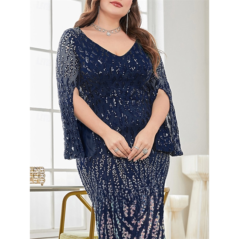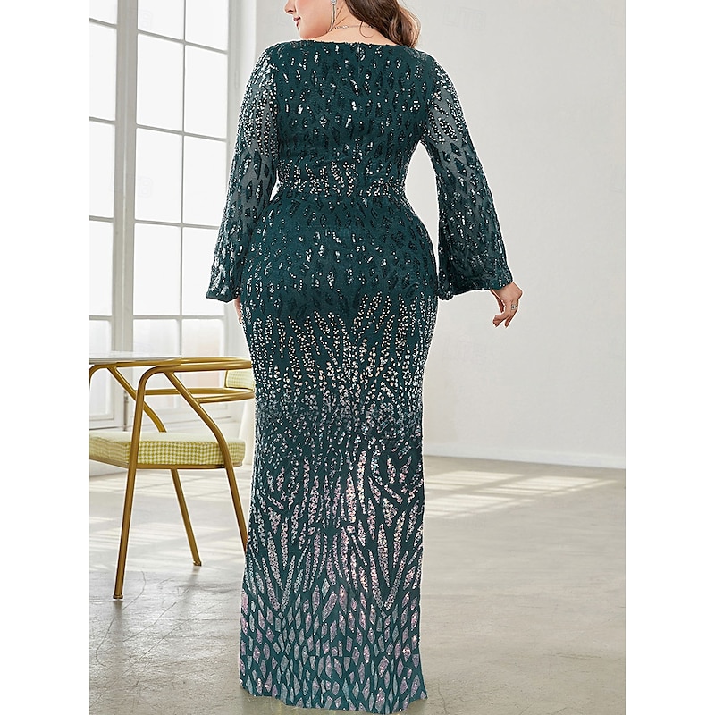 Plus Size Dress Mother of the Bride Curve Dress Elegant Party V Neck Floor Length Spandex Long Sleeve with Sequin 8