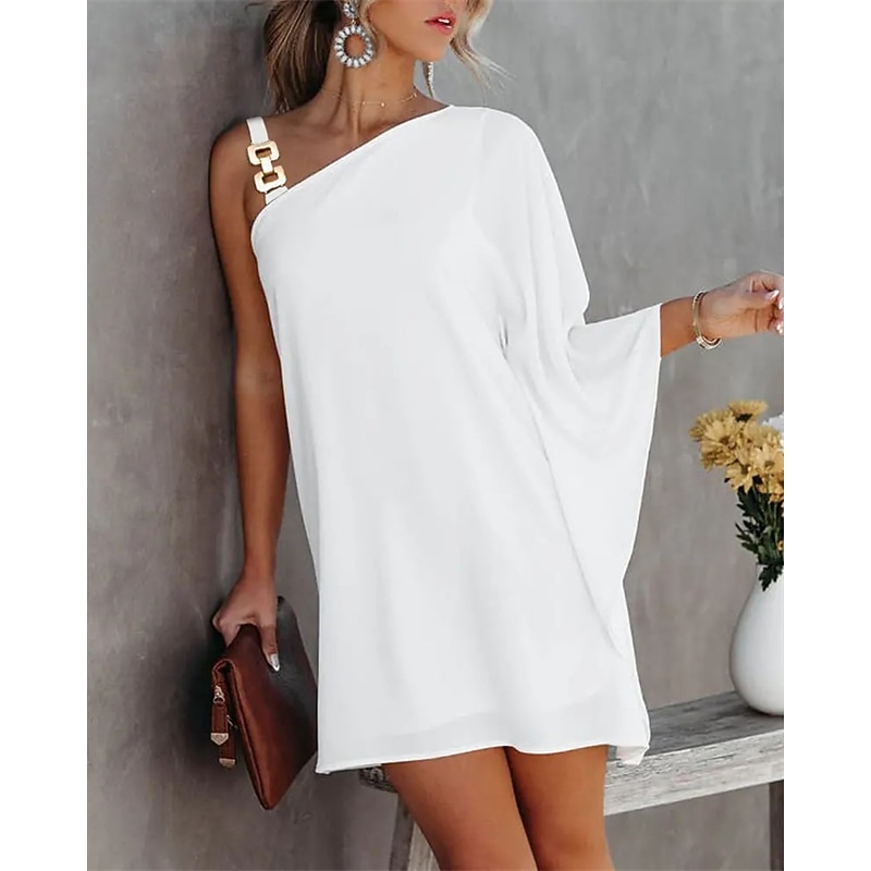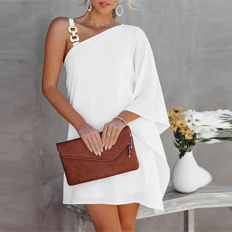 Highlights [Fabric:] Crafted from high-quality polyester, this dress offers a luxurious and comfortable feel. The fabric's micro-elasticity ensures ease of movement, making it an ideal choice for a day-to-night transition. [Fit:] The dress features a loose, relaxed fit that effortlessly flatters a variety of body types. Its draped silhouette is designed to be both chic and forgiving, providing a comfortable yet stylish option for any occasion. [Design Highlights:] This shift dress boasts a trendy cold shoulder design with a striking one-shoulder neckline. The bold gold chain strap adds a glamorous touch, while the asymmetrical hemline introduces a modern flair suitable for both casual and formal events. [Occasions:] Perfect for spring, summer, and fall, this versatile piece is suitable for holidays, daily wear, weekend outings, and more. Whether dressing up for a formal event or keeping it casual, the dress adapts beautifully with the right accessories. [Size Range:] Available in a wide range of sizes, from S to XXL, ensuring that every woman can find the perfect fit.