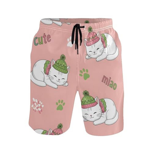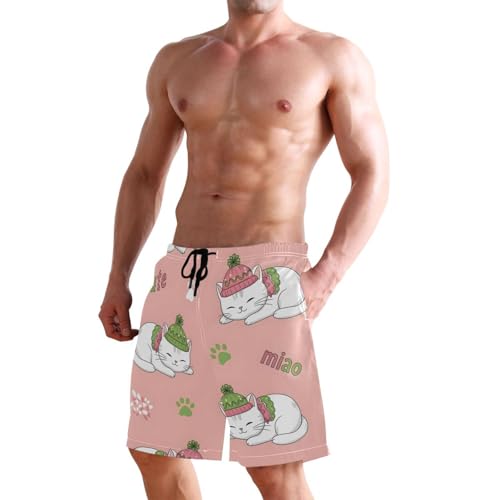 HOT ! Men's Swim Trunks Quick Dry Swimming Shorts with Pocket Cute Cats with Hats Swimsuit Trunks