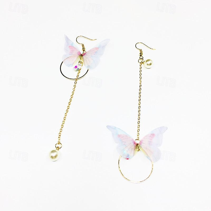 Highlights [Fabric] : These elegant earrings are crafted from high-quality alloy, providing durability and a lightweight feel, making them comfortable to wear for extended periods. The luxurious blend of materials enhances their stylish appeal, perfect for any occasion. [Design Highlights] : The earrings showcase a whimsical butterfly motif, skillfully made from translucent, colorful material that adds an ethereal touch. The butterflies are elegantly suspended from thin golden hoops, adding a luxurious detail to the overall design. A gold-colored chain extends from each earring, finished with a luminous pearl-like bead and a shimmering iridescent orb, offering a captivating play of light and movement. [Occasions] : These versatile earrings are the ideal accessory for various occasions such as parties, evening events, dates, birthdays, and as a thoughtful gift. Their exquisite design ensures they complement both formal and casual attire, adding a touch of elegance and fantasy to any outfit. [Shape and Style] : Featuring a geometric and stylish design, these earrings cater to a sweet and elegant aesthetic, perfect for women seeking to elevate their fashion sense with unique jewelry pieces. [Size Range] : Designed as a standard one-size-fits-all pair, these earrings are suitable for most women, making them an excellent choice for gifting or personal use, ensuring a perfect fit for party and evening wear.