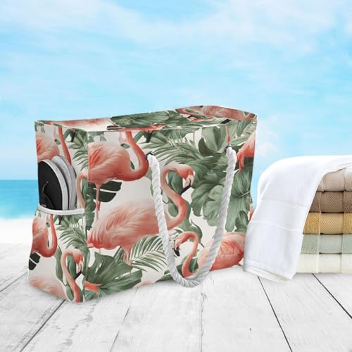 HOT ! susiyo Pink Flamingos Green Leave Beach Bags for Women Large Travel Tote Bag Waterproof Sandproof Lightweight Swim Pool Bag for Family Outdoor