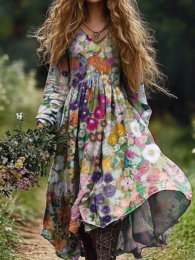 HOT ! Women's Maxi Dress A Line Dress Vacation Casual Boho Going out Beach Loose Fit Floral Graphic Geometric Long Sleeve V Neck Pink Blue Orange Green Spring Fall