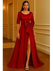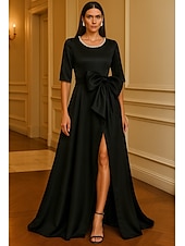 Black Red A-Line Evening Gown Elegant Dress Formal Wedding Floor Length Half Sleeve Crew Neck Pocket Satin with Bow(s) Pearls 2025