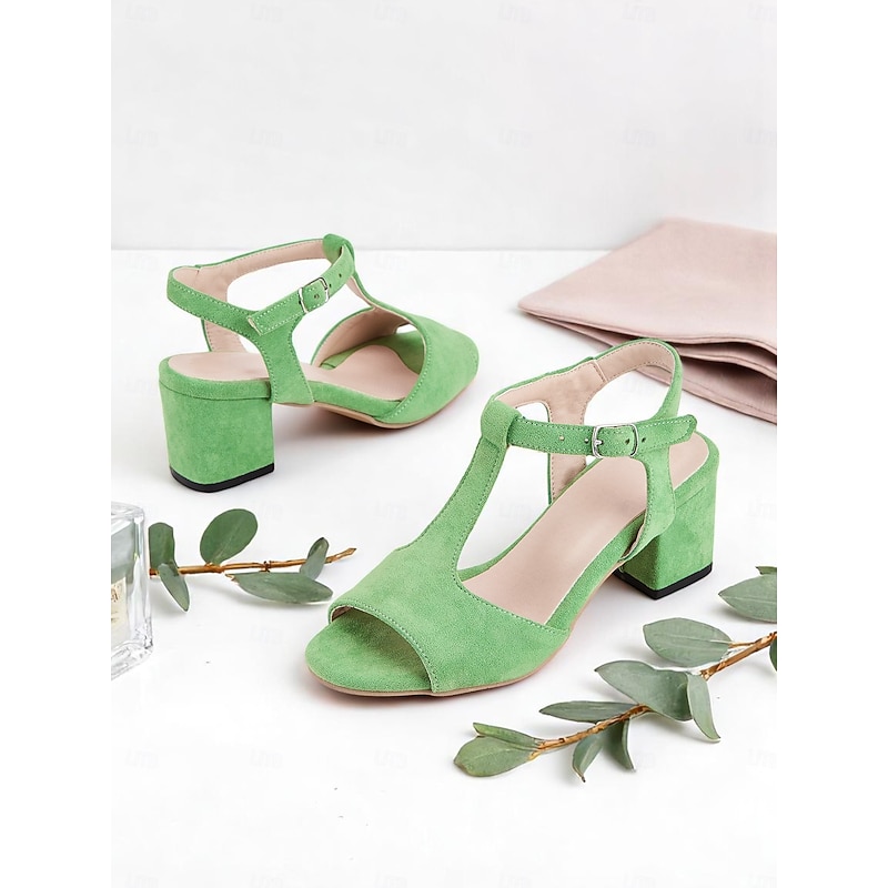 Women's Green Chunky Heel Sandals – Retro T-Strap Open Toe Faux Suede Shoes for Summer Workwear & Casual Street Style 1