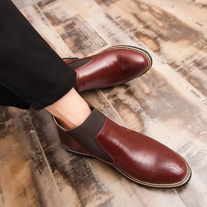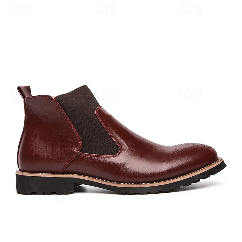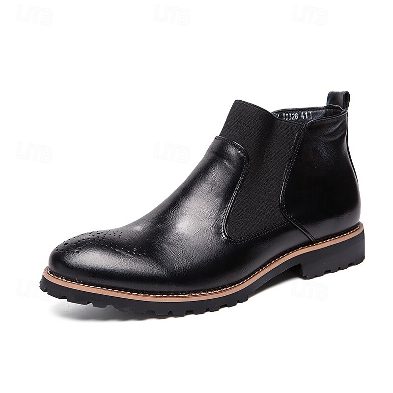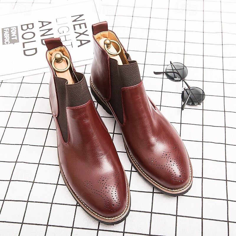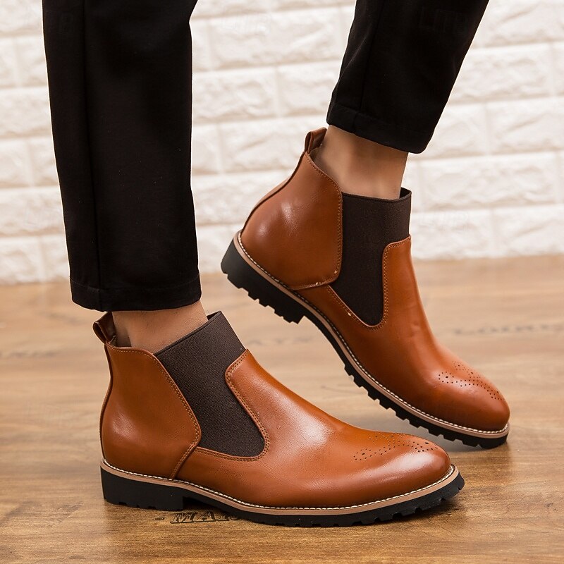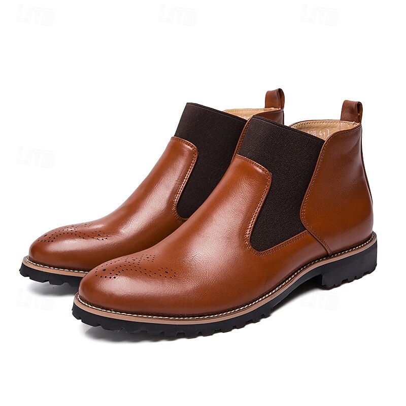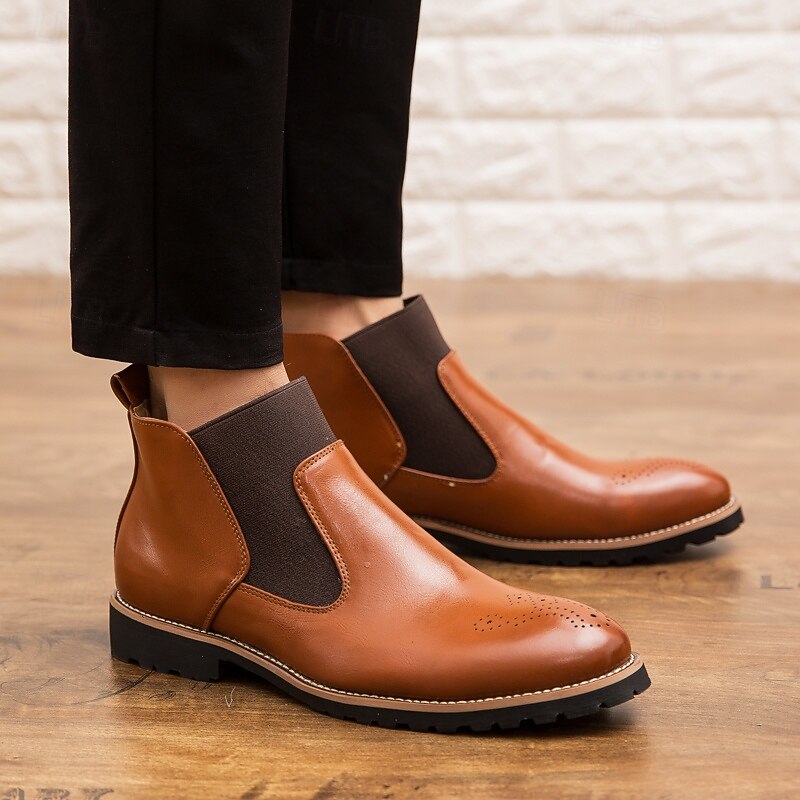 Highlights [Material/Construction] : The Men's Brown Faux Leather Chelsea Boots are crafted from high-quality PU Leather, providing both a polished appearance and long-lasting durability. The lining also features PU material, ensuring a comfortable fit for extended wear. [Fit/Style] : These boots boast a sleek, minimalist Chelsea design, offering a round toe shape. This classic style is the perfect blend of casual and business aesthetics, making them suitable for a variety of outfits and occasions. [Design Highlights] : The boots feature intricate perforated detailing on the upper for an extra touch of sophistication. Equipped with elastic side panels and a convenient pull tab at the back, they provide easy slip-on comfort. The rubber outsole ensures excellent traction and slip resistance, making these boots practical for everyday use. [Occasions] : Ideal for a wide range of settings, these versatile boots are perfect for vacation trips, daily wear, and both casual and business environments. Their classic design and comfortable construction make them an essential addition to any wardrobe. [Size Range] : Available in various sizes to suit different preferences, these boots come in options ranging from US7 / EU39 / UK6 to US11 / EU44 / UK10, ensuring a comfortable fit for a wide array of customers.