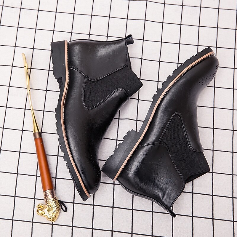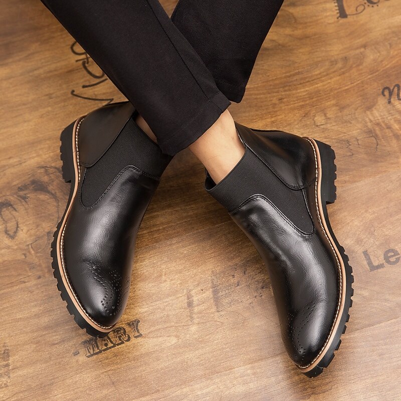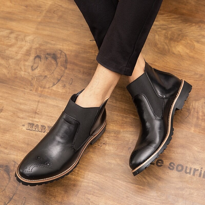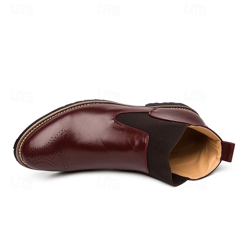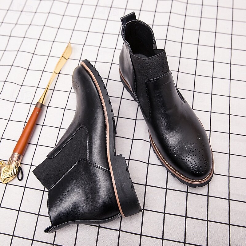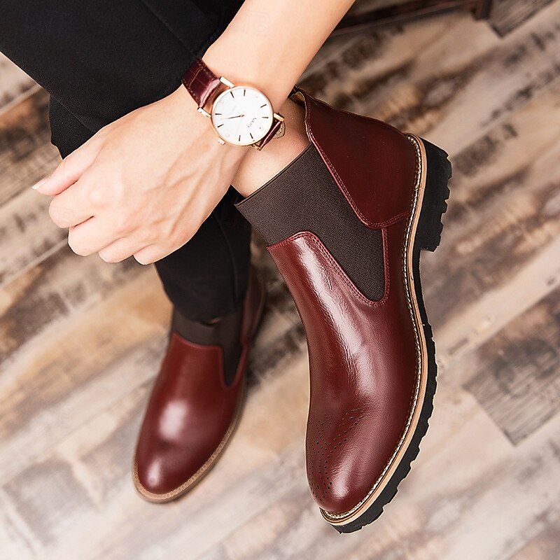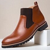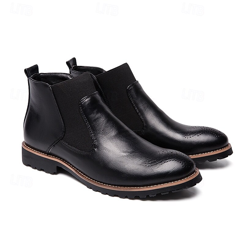 Highlights [Material/Construction] : The Men's Brown Faux Leather Chelsea Boots are crafted from high-quality PU Leather, providing both a polished appearance and long-lasting durability. The lining also features PU material, ensuring a comfortable fit for extended wear. [Fit/Style] : These boots boast a sleek, minimalist Chelsea design, offering a round toe shape. This classic style is the perfect blend of casual and business aesthetics, making them suitable for a variety of outfits and occasions. [Design Highlights] : The boots feature intricate perforated detailing on the upper for an extra touch of sophistication. Equipped with elastic side panels and a convenient pull tab at the back, they provide easy slip-on comfort. The rubber outsole ensures excellent traction and slip resistance, making these boots practical for everyday use. [Occasions] : Ideal for a wide range of settings, these versatile boots are perfect for vacation trips, daily wear, and both casual and business environments. Their classic design and comfortable construction make them an essential addition to any wardrobe. [Size Range] : Available in various sizes to suit different preferences, these boots come in options ranging from US7 / EU39 / UK6 to US11 / EU44 / UK10, ensuring a comfortable fit for a wide array of customers.