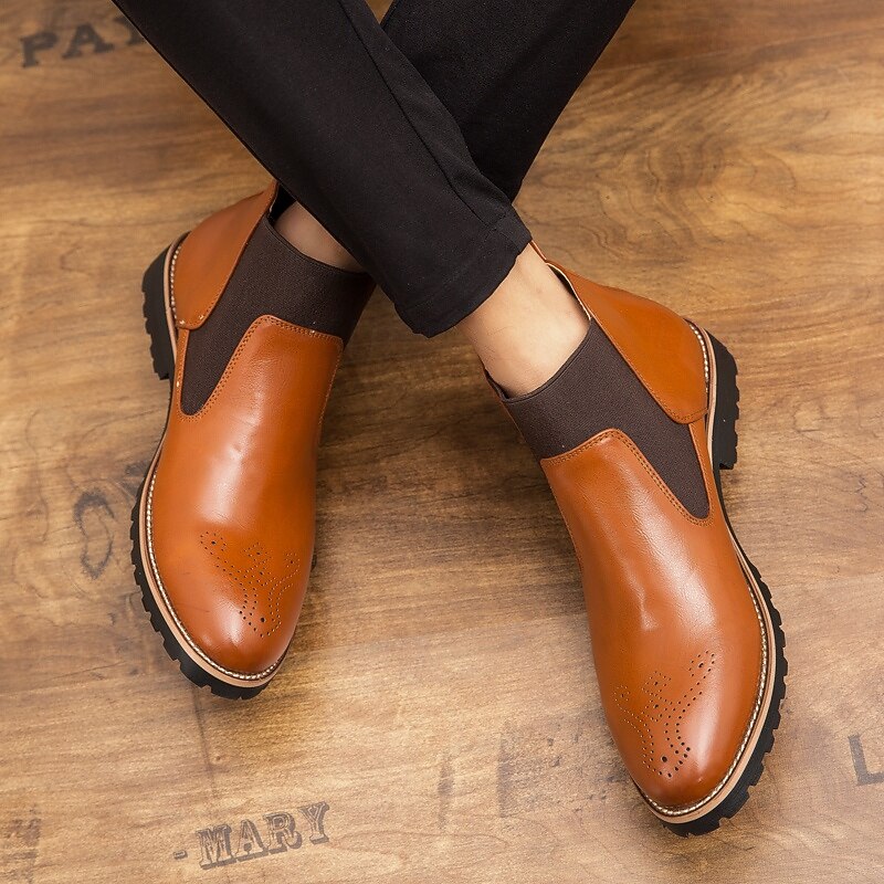 HOT ! Men's Brown Faux Leather Chelsea Boots – Stylish Slip-On Ankle Boots with Rugged Tread and Perforated Detailing