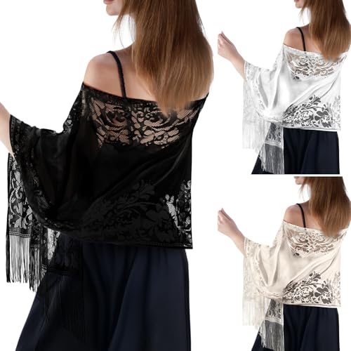 • Timeless Elegance in Every Stitch: discover the charm of our lace capes and scarves, a must have for every wardrobe; These 1920s capes come in 3 vintage colors: black, white, and beige; They feature delicate floral lace crocheted designs and elegant fringe, and can be easily transformed into scarves, tops, or capes, making them both fashionable and practical