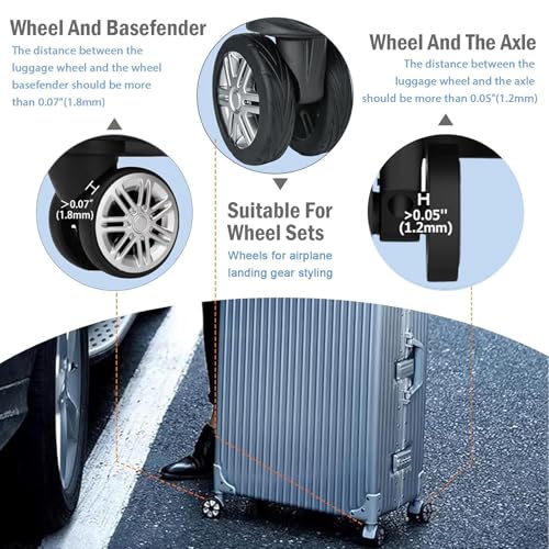 • Carry on suitcase wheel protector set include 8 pieces wheel covers, it has 6 different colors for choose, it fits wheels diameters between 1.97"-2.36"/5cm-6cm. The wheel base clearance should be at least 0.07 inches, and the axle clearance should be at least 0.05 inches.