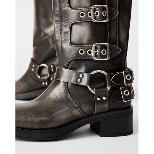QIV Wide Calf Knee High Motorcycle Boots for Women – Chunky Heel Biker Riding Boots with Buckles & Rivets, Vintage Punk Style 5