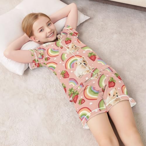 HOT ! ALAZA Strawberry Puppy Dog Rainbow Blossom Pajamas Satin Pajama Set Short Sleeve Button Down Sleepwear