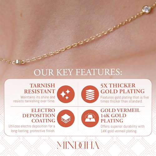 • ELEGANT GOLD PLATED CHARM NECKLACE: The MINDDHA gold plated station necklace is designed with delicate cubic zirconia charms that sophisticates to any outfit. This dainty gold plated necklace with 3 inch extender is making a versatile addition to your jewelry collection.