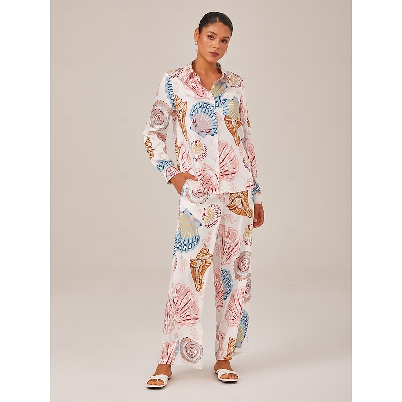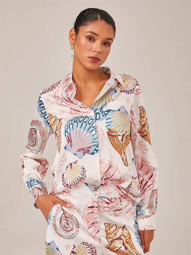 HOT ! Shell Print Button Down Relaxed Long Sleeve Shirt