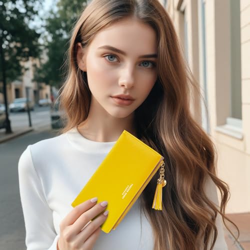 KOTORA Womens Slim Wallet Girls Thin Wallets Pretty Mini Long Card Holder Small Tiny Clutch Zip Purse Love Pendant Tassels Billfold (Yellow) 4