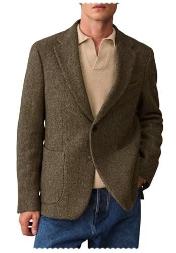 HOT ! Men's Vintage Herringbone Blazer Single Breasted Tweed Blend Sports Jacket with Pockets