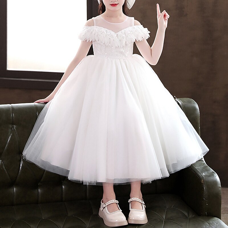Kids Girls' Party Dress Solid Color Long Sleeve Special Occasion Princess Polyester Party Dress Summer Spring 4-13 Years White Champagne Pink 1