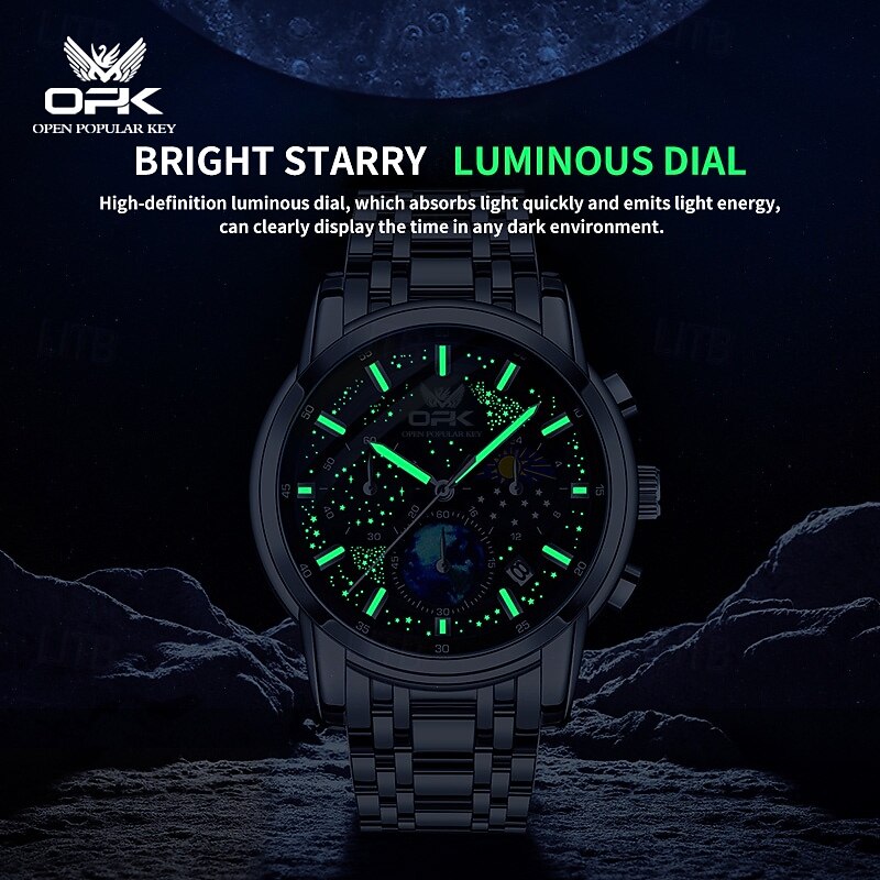More information about OPK Quartz Watch for Men Starry Sky Display Moon phase Multifunctional Stainless Steel Waterproof Luxury Men's Quartz Watch 8142