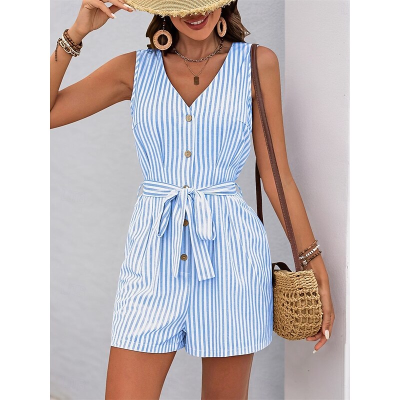 More information about Women's Normal Romper Active Striped Sleeveless V Neck Buttons Pocket Vacation Daily Loose Fit Khaki Light Blue Summer