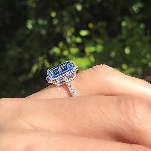 925 Sterling Silver Plated Emerald Shaped Simulated Blue Topaz CZ Halo Engagement Wedding Ring for Women 5