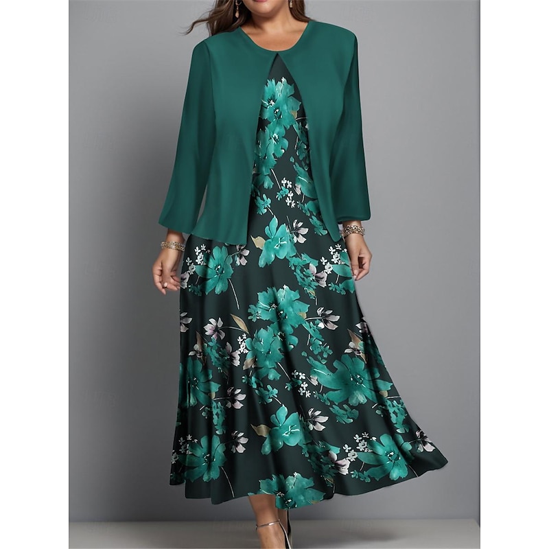 More information about Women's Plus Size Midi Dress Dress Set Casual Dress Swing Dress Print Dress Fashion Streetwear Floral Print Long Sleeve Crew Neck Outdoor Vacation Burgundy Navy Blue Blue Fall Winter Regular Fit