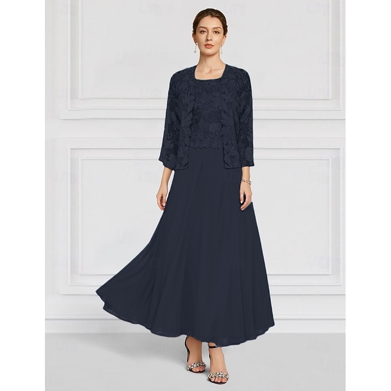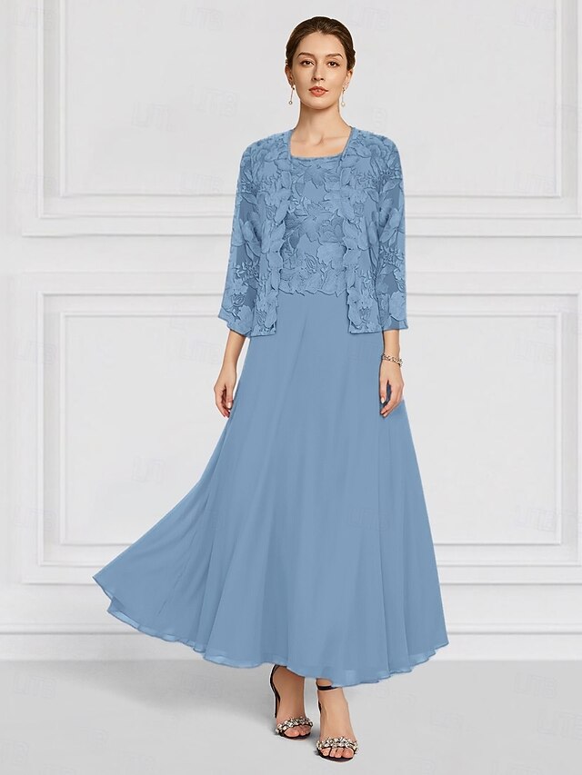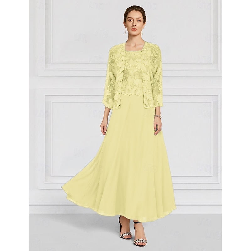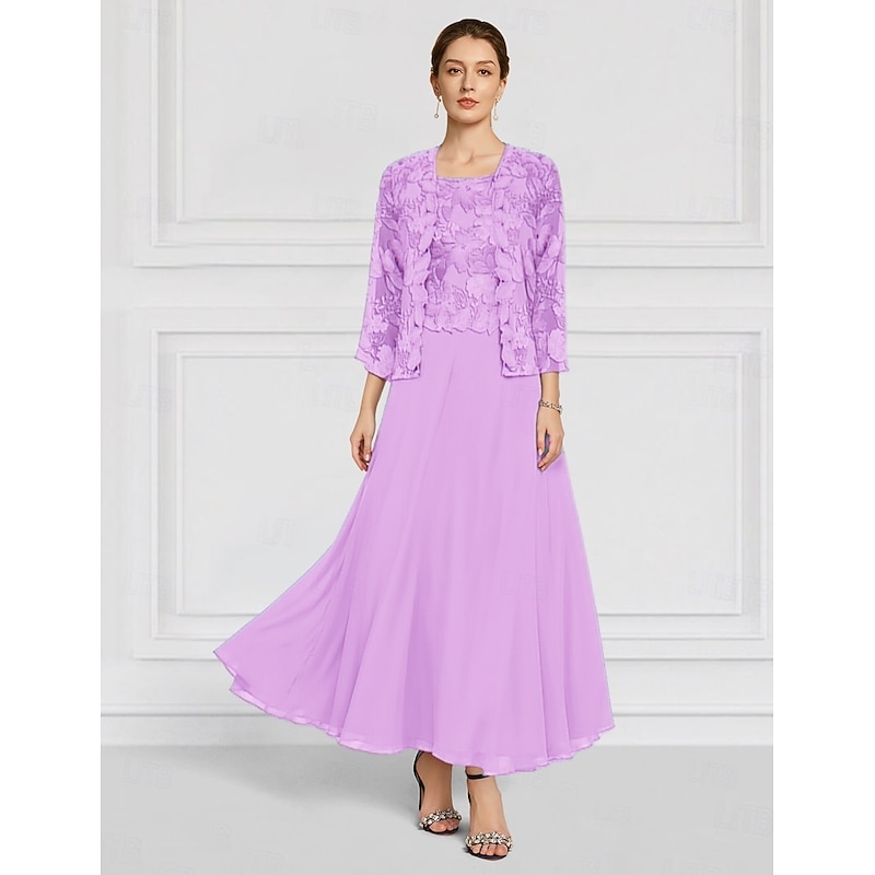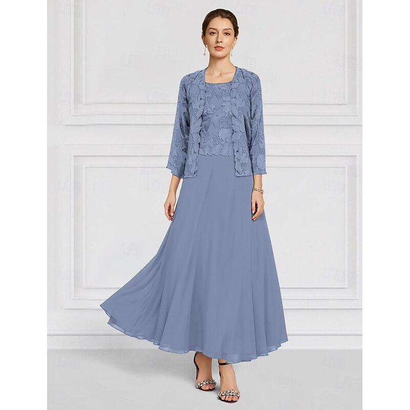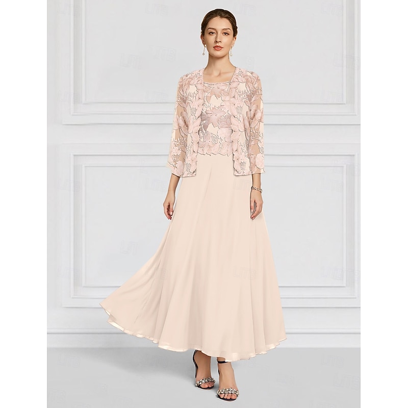 More information about Two Piece Floral Dress Sets Mother of the Bride Elegant Crew Neck Ankle Length Chiffon Long Sleeve with Lace Embroidery