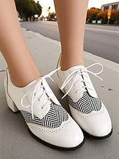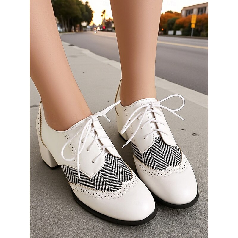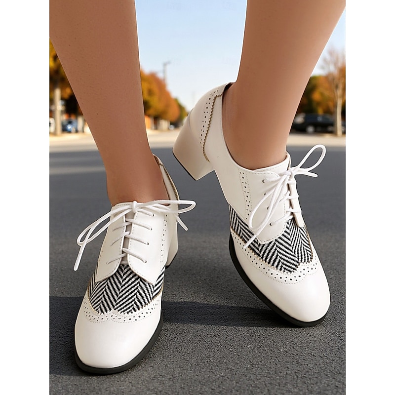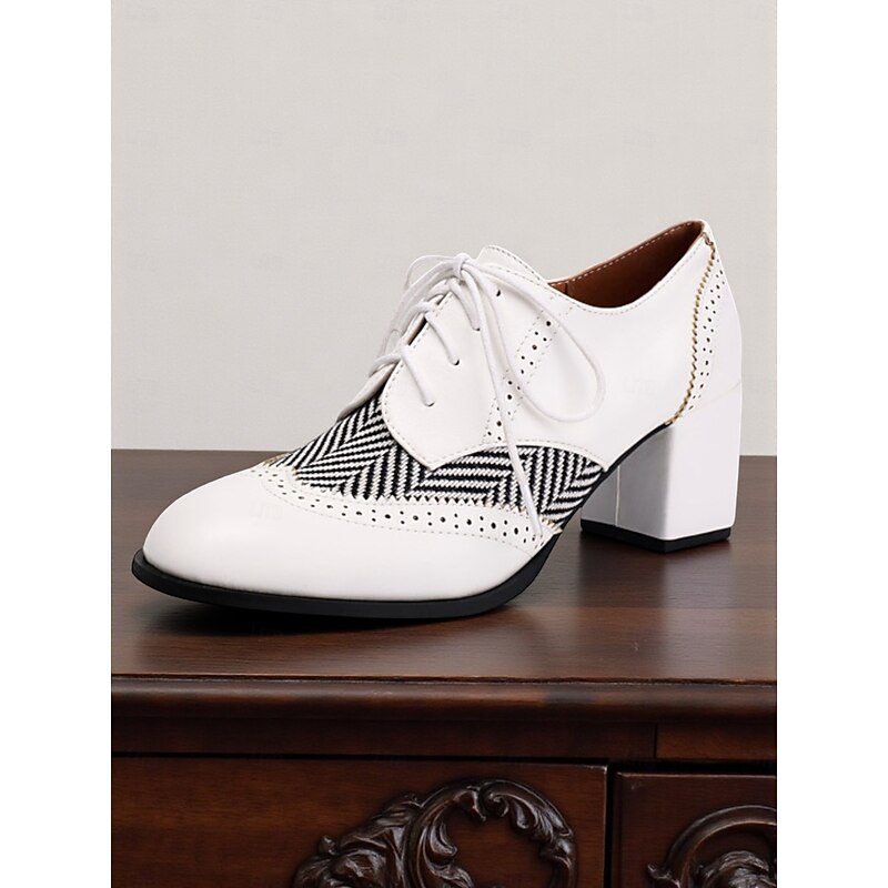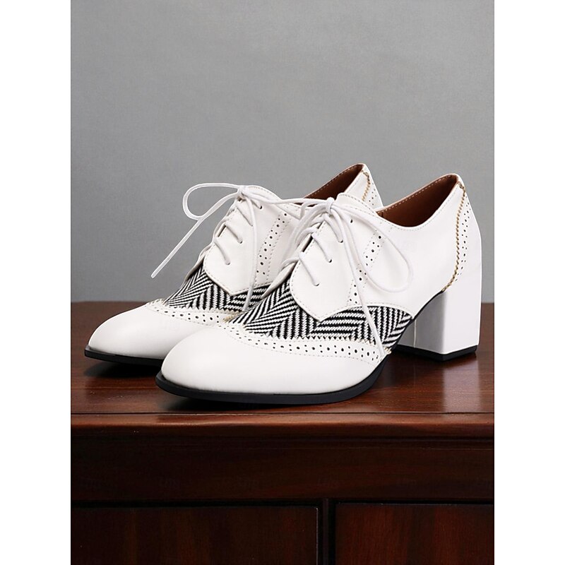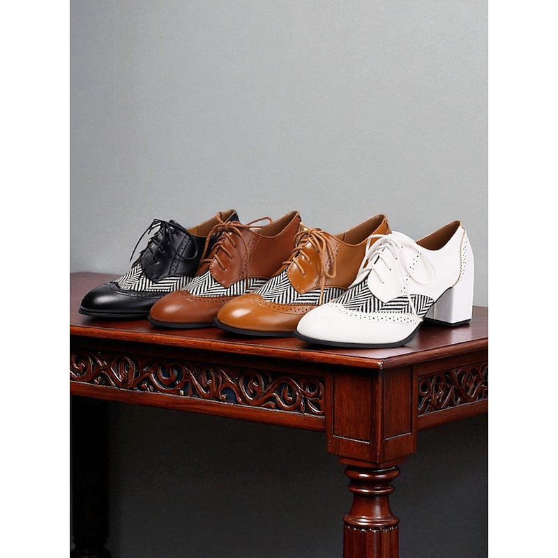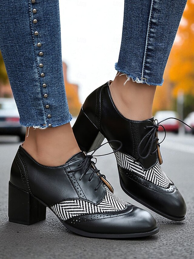 Women's Black Herringbone Oxford Chunky Heel Shoes – 1950s Vintage Faux Leather Brogue Lace-Up Pumps for Work, College and Street Style 21