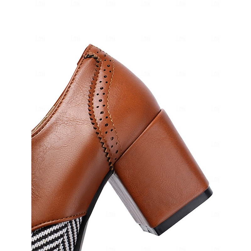 Women's Black Herringbone Oxford Chunky Heel Shoes – 1950s Vintage Faux Leather Brogue Lace-Up Pumps for Work, College and Street Style 7