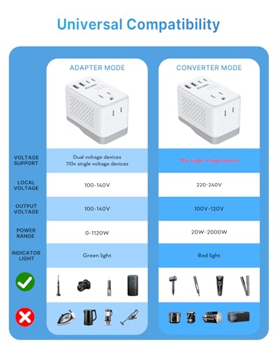 • European Voltage Converter: Power converter mode converts voltage (220-240V, 50/60Hz) to US voltage (110V, 60Hz), maximum support electrical products from 20W to 2000W, suitable for hair dryer, curling iron and other household appliances. The red indicator light on indicates that the input voltage is 220 to 240v, and the green indicator light on indicates the input voltage is 100 to 140v